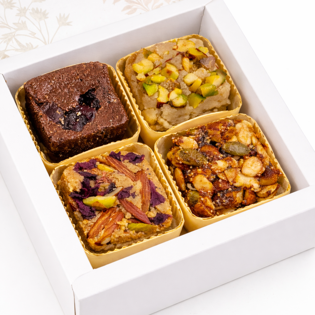 All energy bites are made with a base of nuts and seeds (Cashew monk,Dark chocolate,Date and nut Sattu jaggery), we use Better sweeteners like monk-fruit, dates.