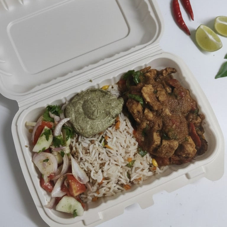 We don’t use plastic packaging for food. We use cornstarch, bagasse or paper.